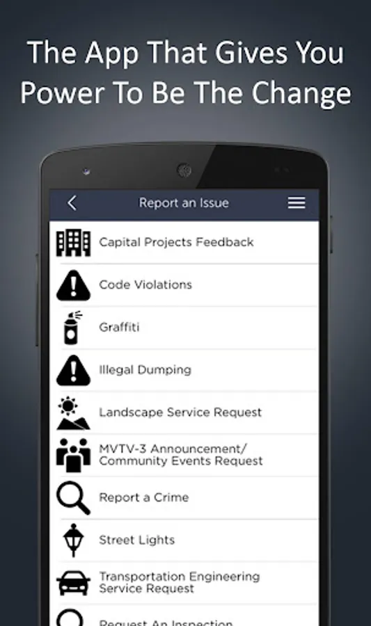 Use the Issue Reporting section to report graffiti, potholes and other issues directly to the correct city department right from your phone. The issues are tracked from the initial report to resolution in the "My Reports" section and you will receive push notifications as your report progresses.
