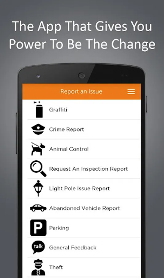 Use the Issue Reporting section to report graffiti, potholes and other issues directly to the correct city department right from your phone. The issues are tracked from the initial report to resolution in the "My Reports" section and you will receive push notifications as your report progresses.