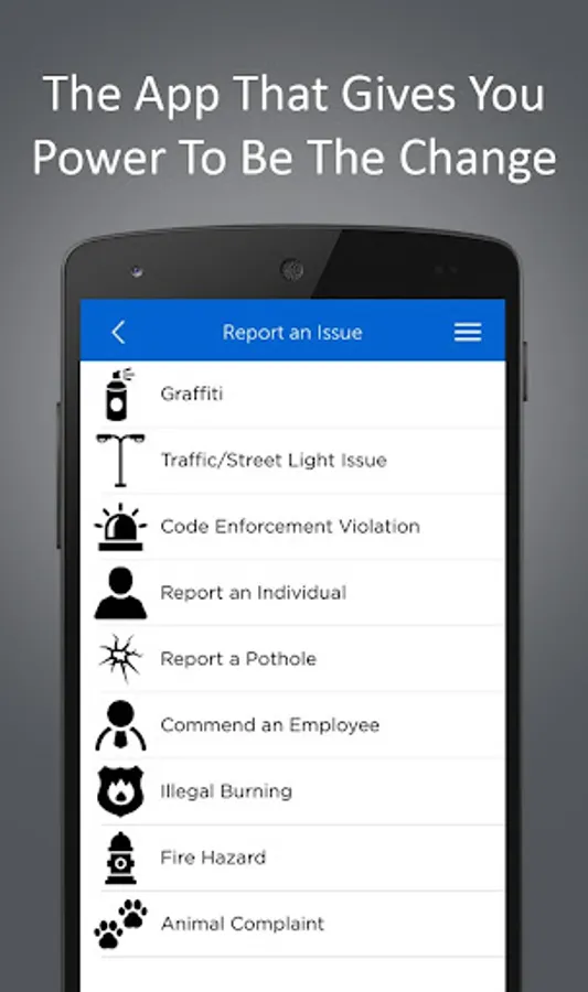 Use the Report an Issue section to report graffiti, potholes and other issues directly to the correct city department right from your phone. The issues are tracked from the initial report to resolution in the "My Reports" section and you will receive push notifications as your report progresses.