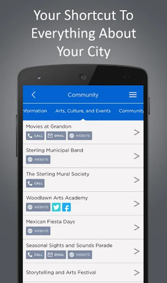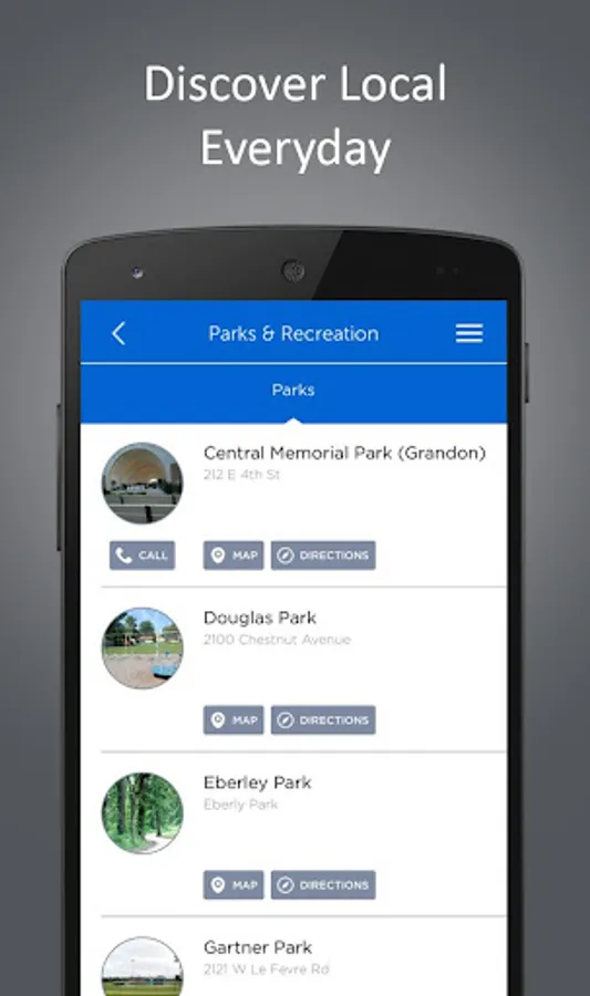 Government and Parks & Recreation sections allow you to have all the important contact and destination information in your city with the click of a button. Learn about your city's history, demographics and elected officials. Find parks, facilities and points-of-interest along with information, phone numbers, maps and directions.
