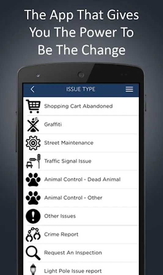 Use the Issue Reporting section to report graffiti, potholes and other issues directly to the correct city department right from your phone. The issues are tracked from the initial report to resolution in the "My Reports" section and you will receive push notifications as your report progresses.