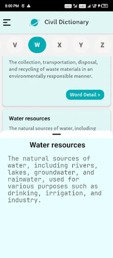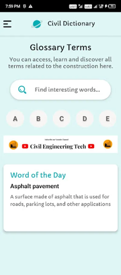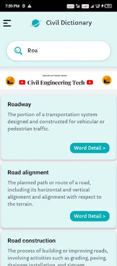 The app offers a powerful search feature that allows users to quickly find specific terms by entering keywords or phrases. Whether you're looking for definitions of construction materials, structural elements, surveying techniques, or any other aspect of civil engineering, the search feature ensures efficient and precise results.