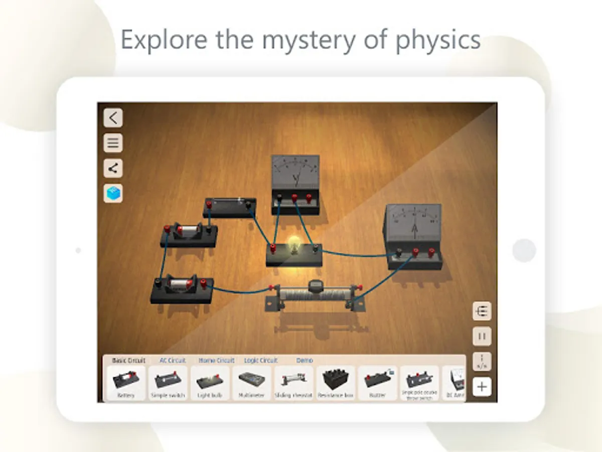 Play with various circuit components, build your own 3D electric circuits, and see how they work in real-time. Anyone can enjoy the fun of scientific experiments. Perfect for teachers to demonstrate physics experiments in class and for students to explore inside and beyond classrooms.