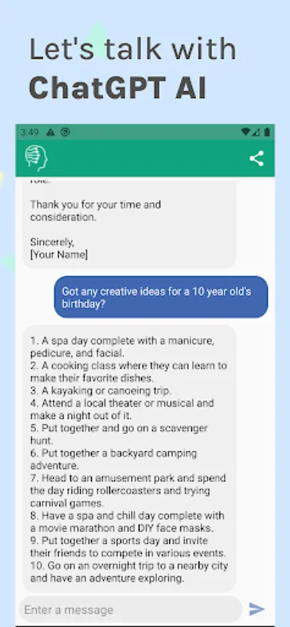 Overall, MyAI - AI Chatbot Assistant App is an incredibly versatile and powerful application that can help you with a wide range of tasks and provide you with a highly intelligent and personalized conversational experience. With its user-friendly interface, advanced natural language processing algorithms, and ability to learn and adapt to individual users over time, MyAI - AI Chatbot Assistant App is the perfect tool for anyone looking for an intelligent conversation partner or virtual assistant.
