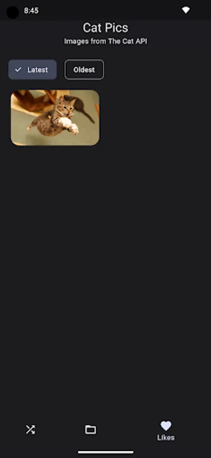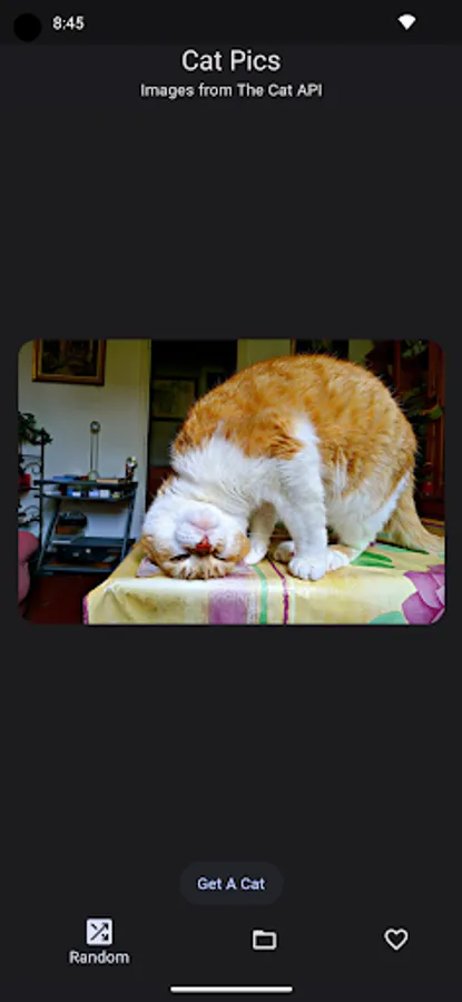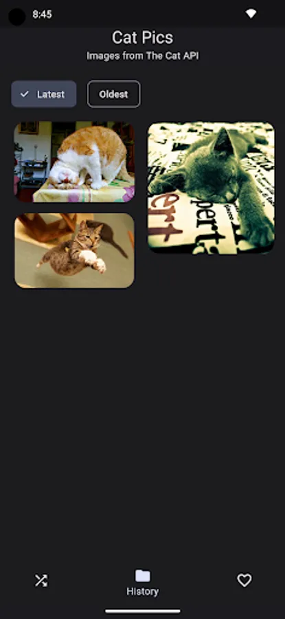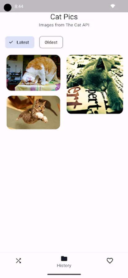 This app displays random pictures of cats which are automatically saved to history. You can remove them from history or mark them as your favorites. The images are provided by TheCatAPI
