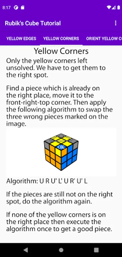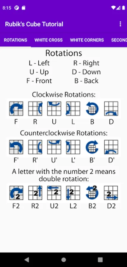 This app lets you know how to solve a Rubik's cube. It is designed for beginners and contains the classic method. Just read and solve!