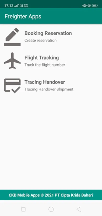 Freighter is an application to monitor cargo delivery by Freighter (Aircraft) based on its route in Cipta Krida Bahari (CKB). You can create booking reservation before cargo is transported and change actual cargo delivered. Create flight schedule, and change flight tracking data based on routes by its schedule. And you can do manage handover coloader from customer and take a picture of manifest cargo as proof of cargo documentation.