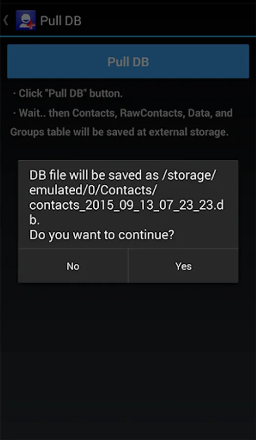 ·You can pull Contacts, RawContacts, Data, and Group database contents to the external storage.