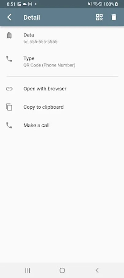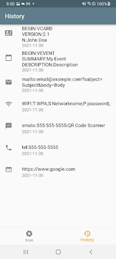 - Saved in Text, URL, TEL, SMS, EMAIL, WiFi, vCard, MECard type.