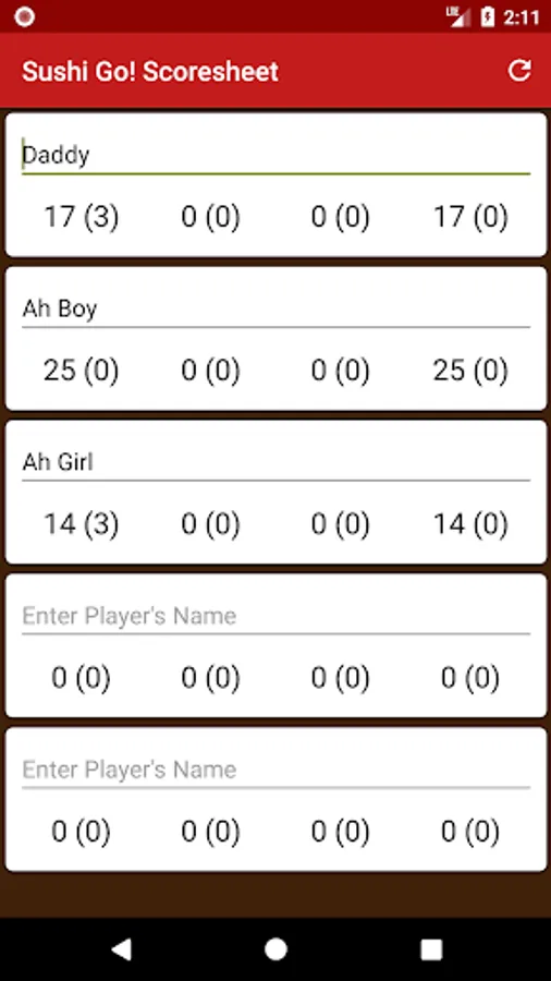 App that allows one to enter the cards for three rounds for up to 5 players and will total up the scores for every player.