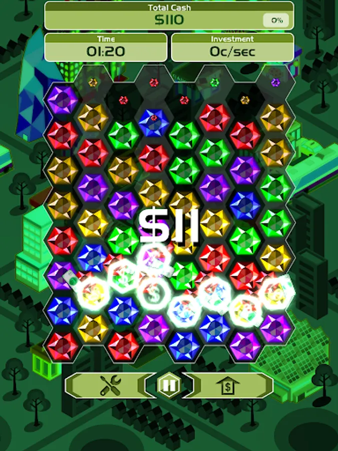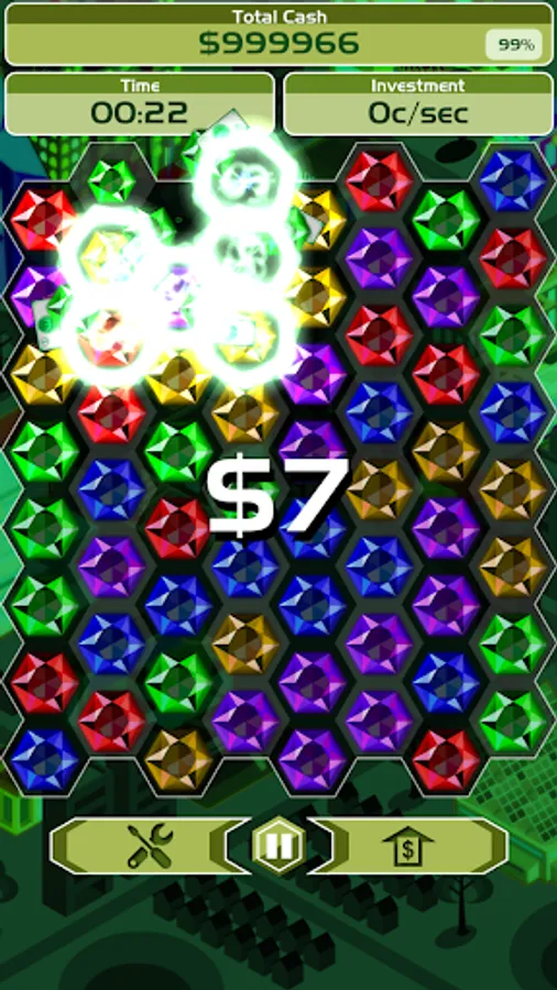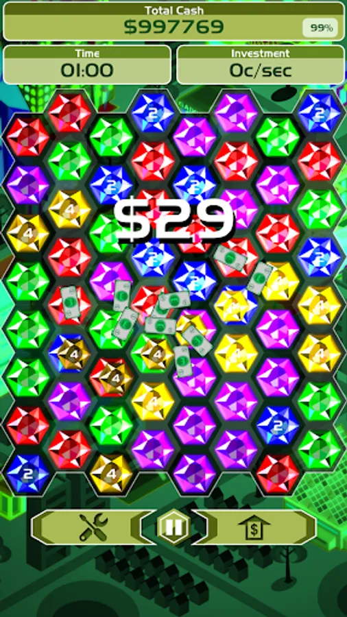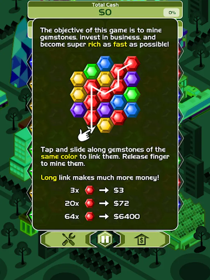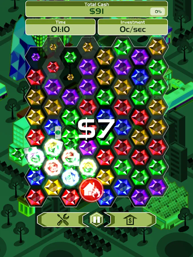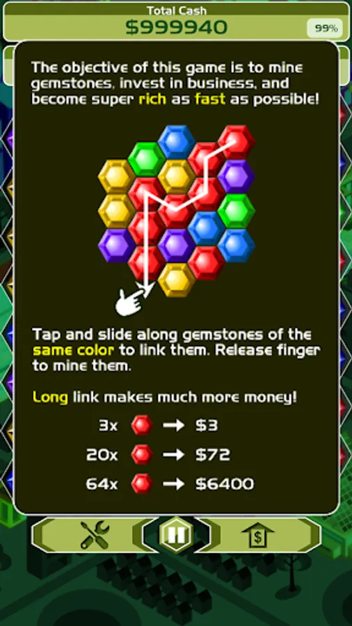 Billionaire Blitz is the most addictive fusion of puzzle and strategy games. Link gemstones of the same color to mine them and make money. Upgrade the mining tools to make more money per gemstone. Invest the money into business and watch your money grow continuously as you mine. Reach the earning target as fast as possible to conquer the leaderboards!