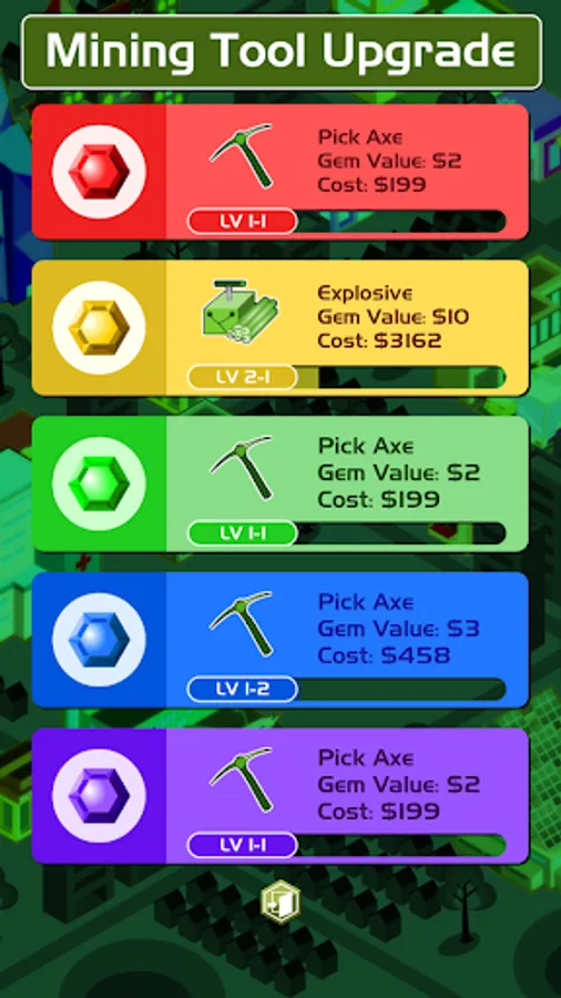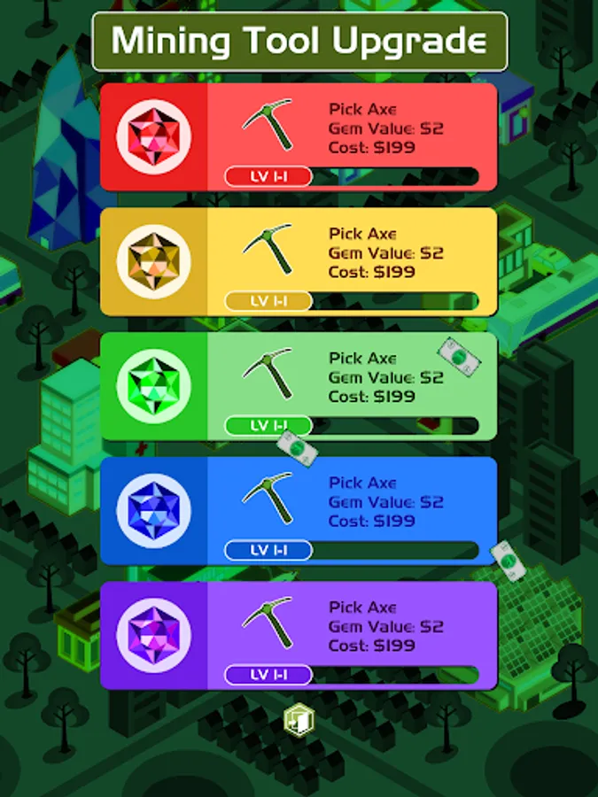 - 24 levels of mining tool upgrades;