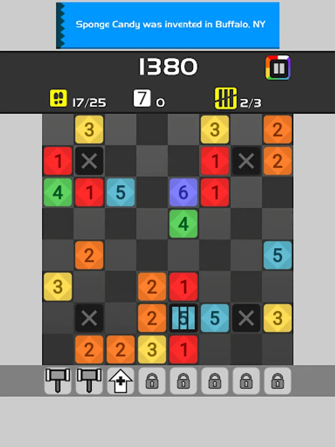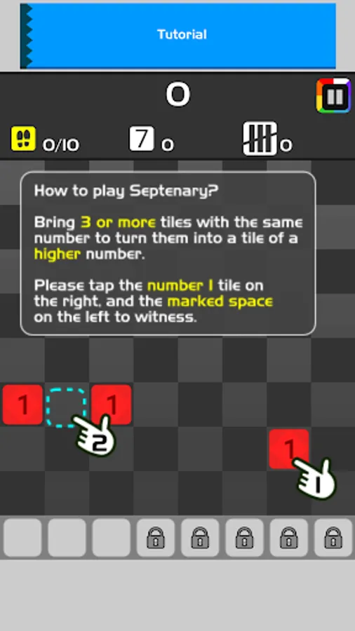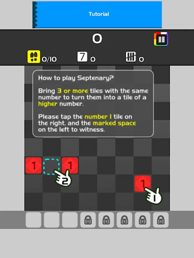 Septenary is an addictive number strategy game based on a simple mechanic: move number tiles around on a 8x8 grid so that same-number tiles touch each other and fuse into a larger number tile. The larger the number, the higher the score. Fusing more than three tiles and creating chains grant special tools that can help in tricky situations.