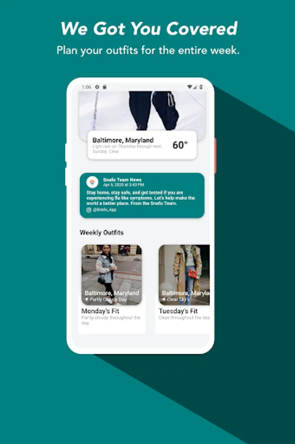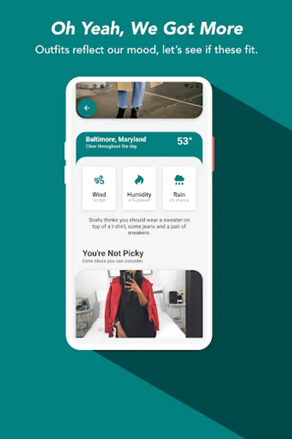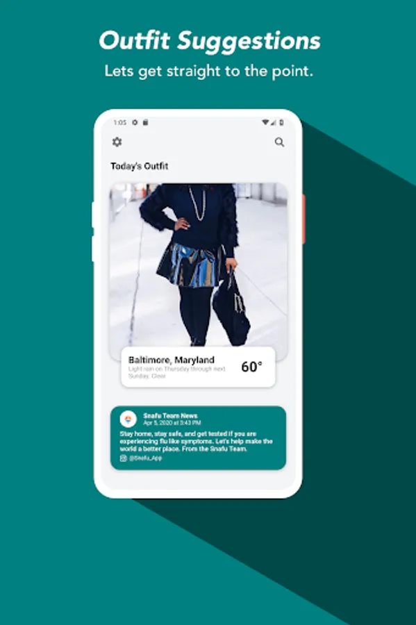 Do you ever wake up in the morning and wonder what to wear? Well wonder no more! This weather app is unlike any other! While Snafu provides you with all the basic features of an ordinary weather app, it also gives you a detailed report on what to wear for the day and the rest of the week! Snafu personalizes your outfit based on gender and preferred style, whether it’s formal or casual. Snafu calculates the best possible outfit for the day by not only taking into account gender and style, but also temperature, wind, and precipitation. But don’t just count on Snafu to tell you what to tell you what to wear. Check out the discover page and see what other people are wearing in your area and around the world!