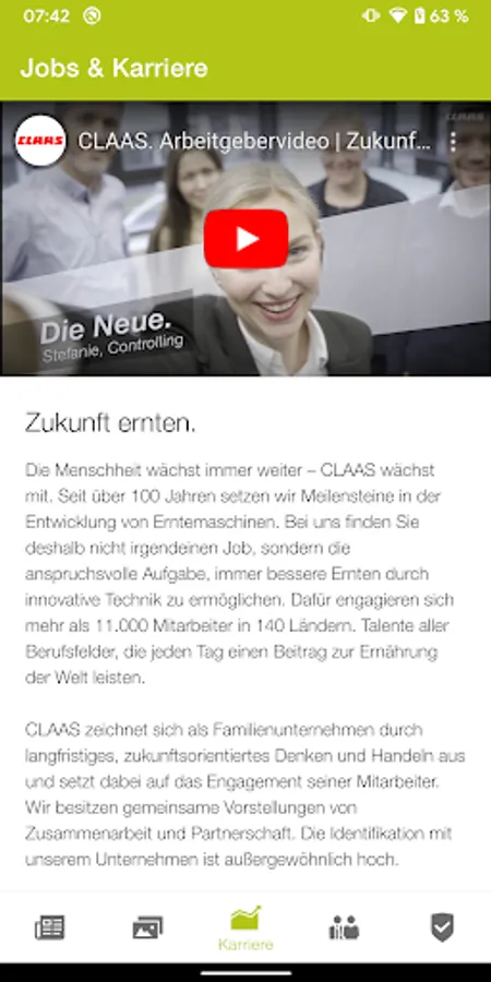 My CLAAS is an app for employees and those who want to become one. In addition, you will find information and background information about the company, the career area and other exciting content.