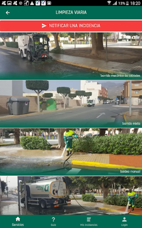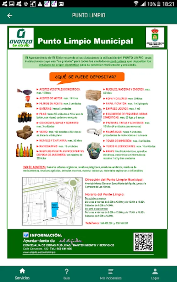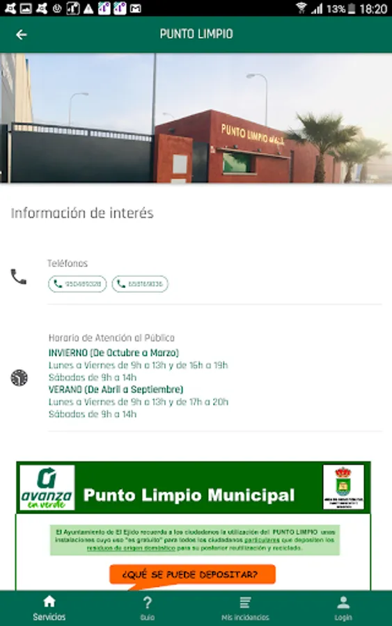 Avanza en Verde El Ejido is the App that the City of El Ejido puts at the disposal of its citizens to be INFORMED of street cleaning services, beach cleaning and waste collection and can NOTIFY INCIDENTS to them.