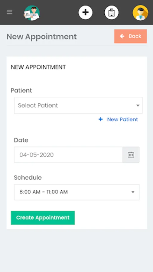 -- Select existing patient from drop down or for new patient click on "+ New Patient"