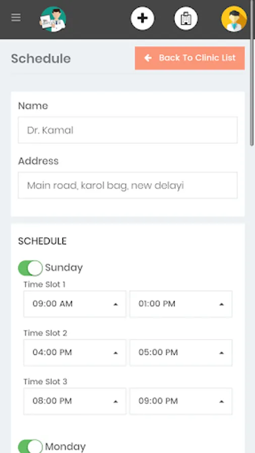 *Note: If Clinic schedule day and time is not setup than here schedule will not show.
