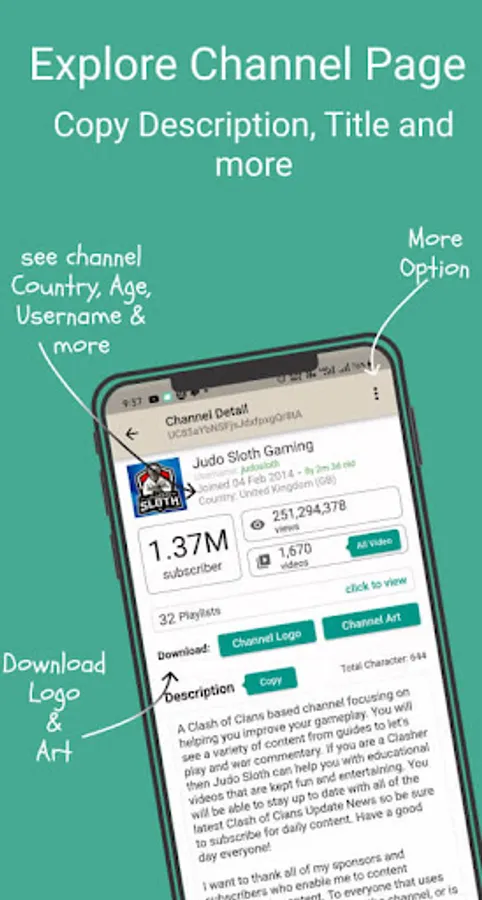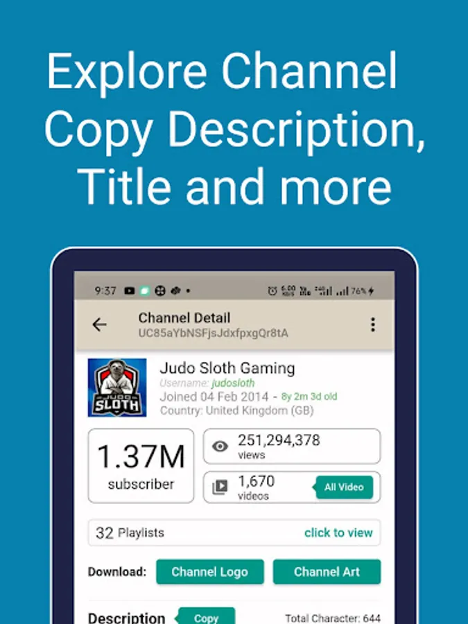 View channel details just like subscribe, total videos, total view, channel country description, and more. Also, copy the description and view all videos on the channel.