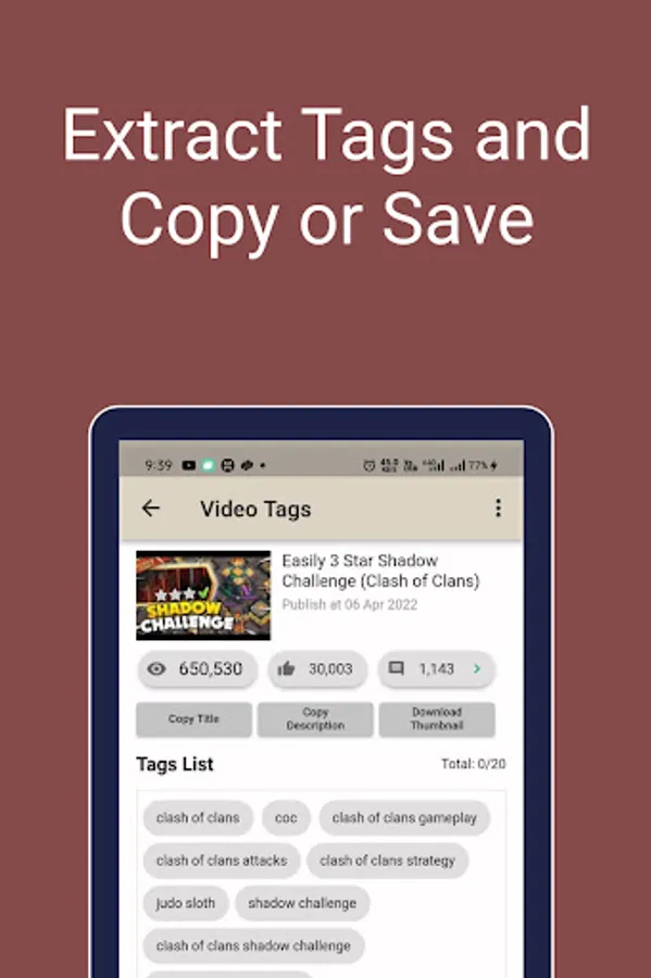 With this feature, you can extract tags from other videos and easily copy all or selected tags. Also, you can save selected tags to a topic planner. Also, you can copy and save video titles and descriptions.
