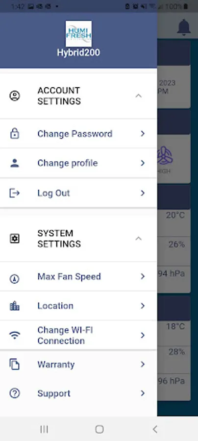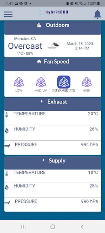 The mobile application serves to monitor the Hybrid-200 ventilation system in real time. It will provide customers with the ability to monitor conditions and modify settings of their unit. Moreover, it permits the clients to have an idea regarding the temperature and relative humidity collected from indoor and outdoor.