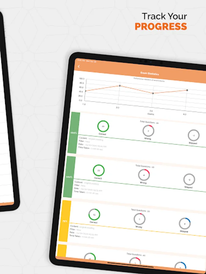 - Track and monitor your progress with detailed statistics. You can review taken tests anytime.