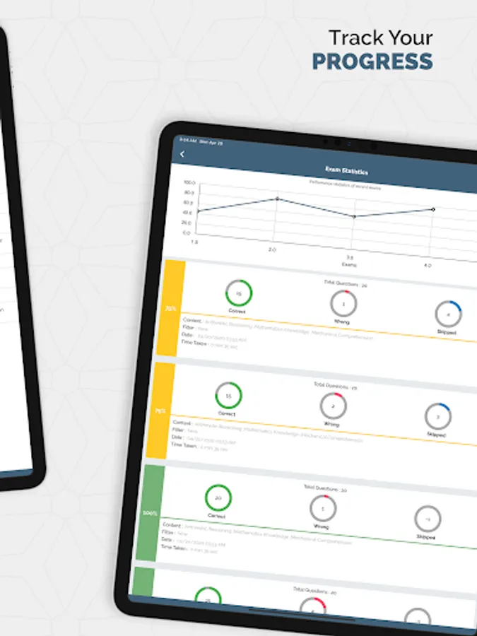 - Track and monitor your progress with detailed statistics. You can review taken tests anytime.