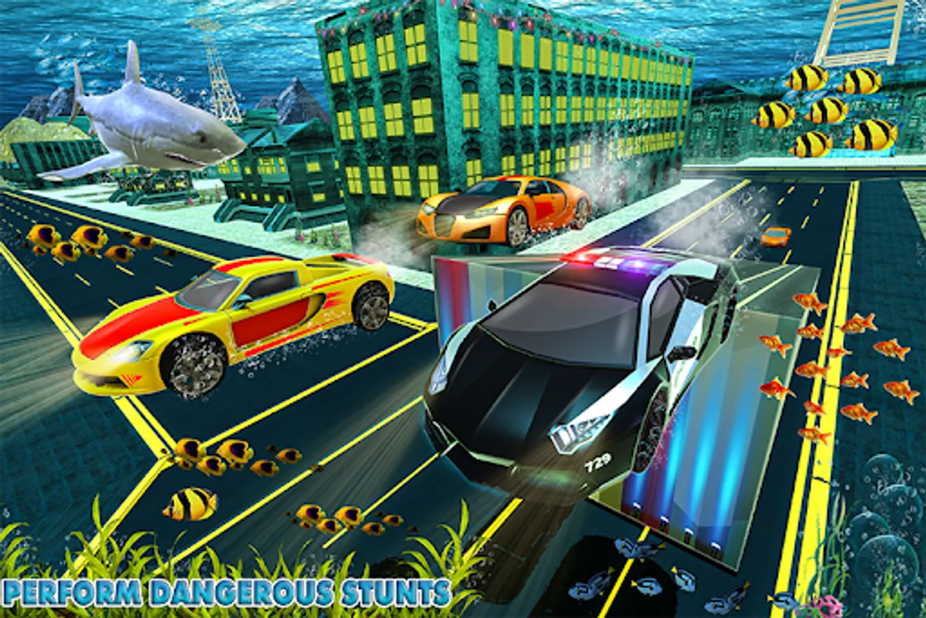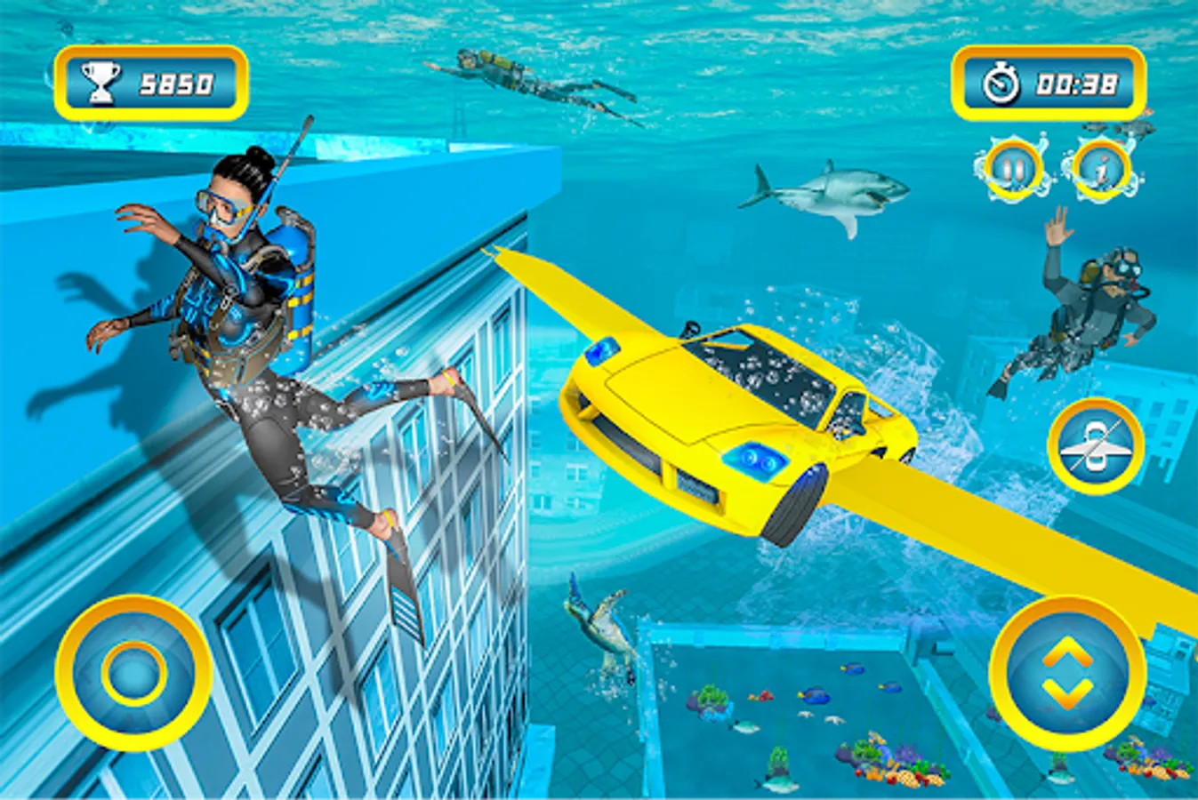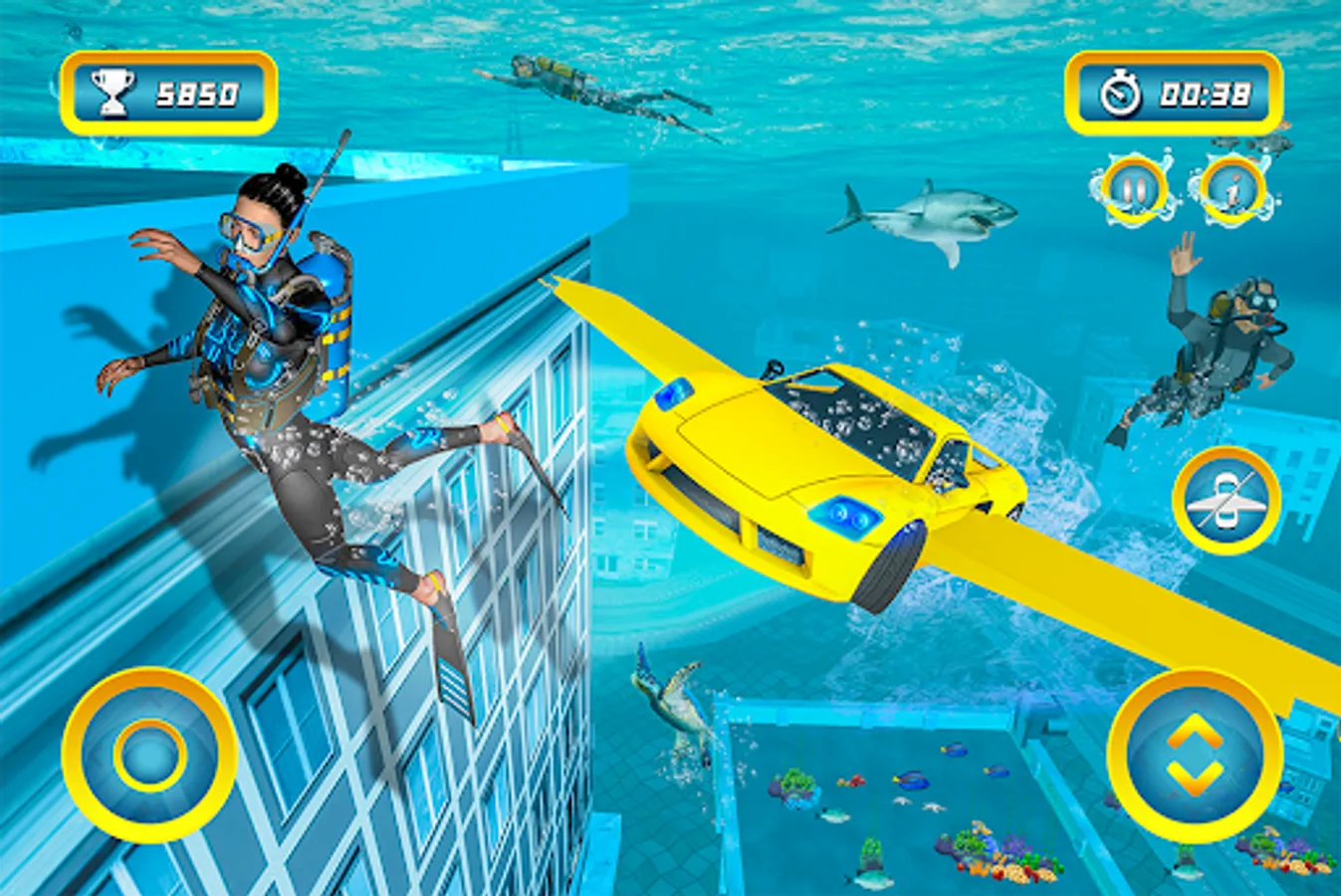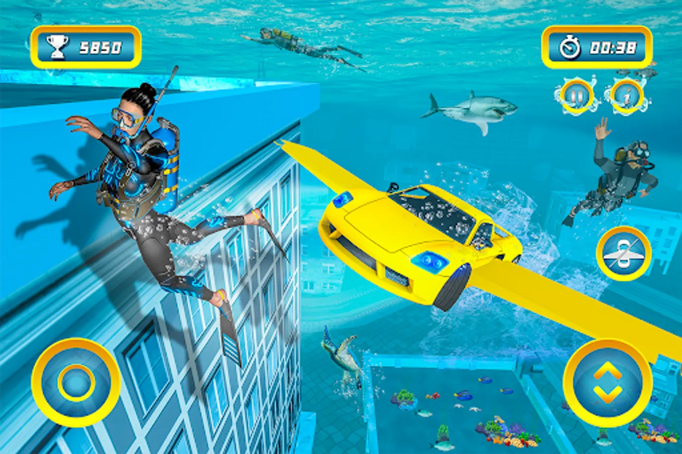 Enjoy the beauty of marine water landscapes and speed up on an especially futuristic cars to complete the level before time. Rescue the city civilians from the building top and drop them on their destination point in the undersea world while playing this underwater city ultimate flying car stunts simulator. Be vigilant from hungry sharks and watch out from the underwater opponents.