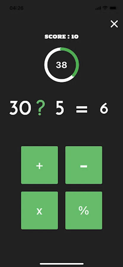 Örnekleri hızlıca çözmek için gerekli becerileri test etmenize ve geliştirmenize yardımcı olan basit bir matematiksel hesaplama oyunu. Oyunda sadece bir hedef var, verilen rakamları hızlıca hesaplamak ve soru işareti yerine hangi operatörün geleceğine karar vermek 60 saniye bittiğinde veya yanlış butona tıkladığınızda oyun biter.