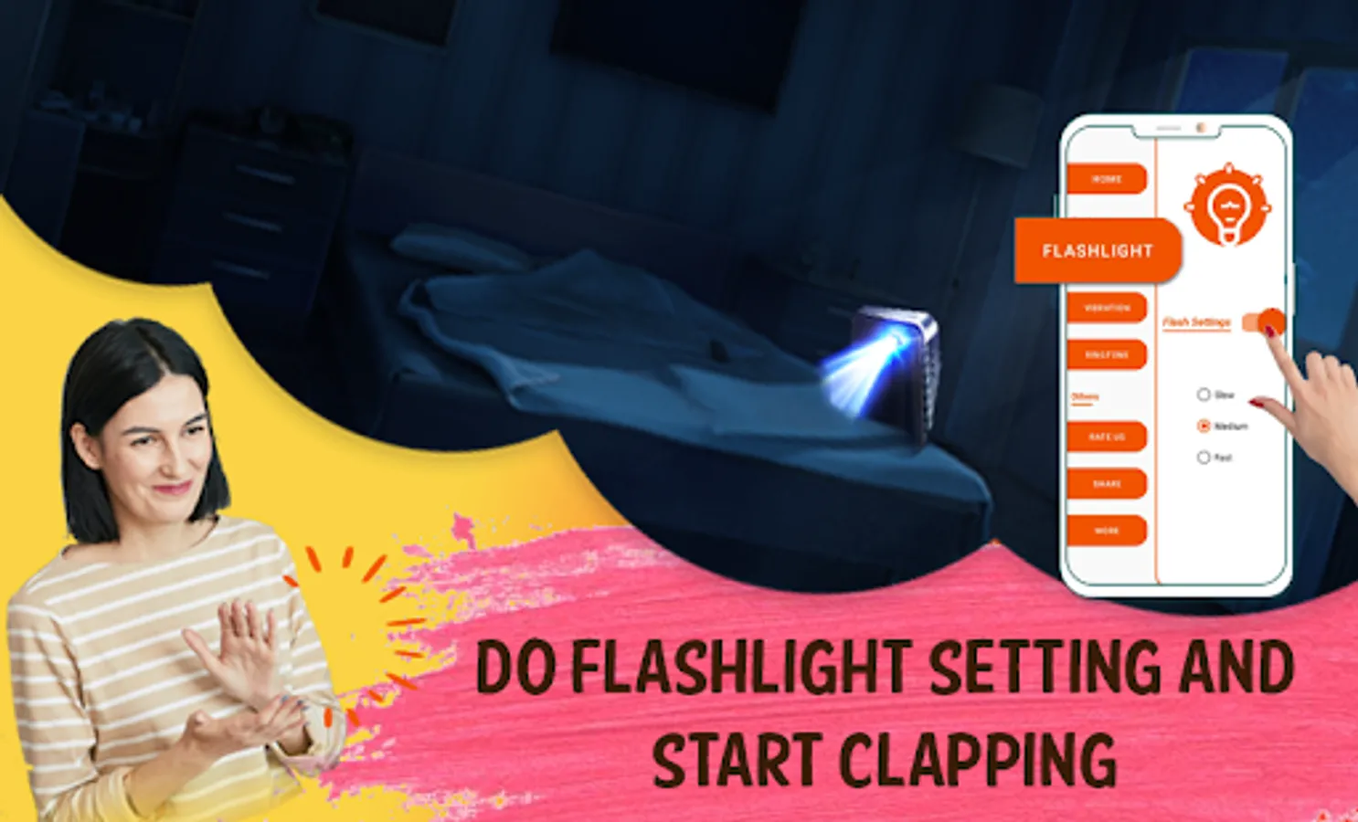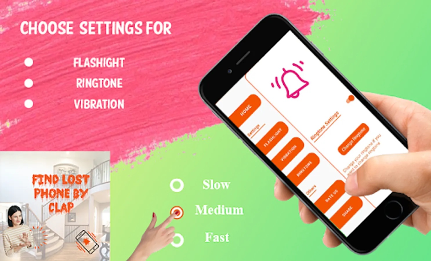 This Clap to Find My Phone: Find Phone by Claping also has the feature of flashlight, like you can turn on flashlight. Why you need flashlight feature to find my lost phone? If you lost your phone in dark room, when you start clapping, flashlight will start blinking and you can find your phone easily. You can also set the frequency of flashlight, like you can set frequency slow, medium or fast. Itβs not enough, you can also set ringtone to find your phone by clapping. Whenever you start clapping, this clap to find my phone with sound will start ringing.