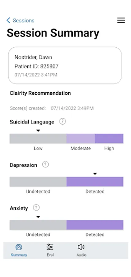 Clairity, a clinical decision support tool, is the result of more than 10 years of patented, published research. The Clairity app empowers mental health professionals to do what they’re best at – providing emotional and psychological support while the Clairity listens in to objectively assess a client’s risk of mental health conditions. Our goal is to support mental health professionals with objective insights to inform their decision-making.