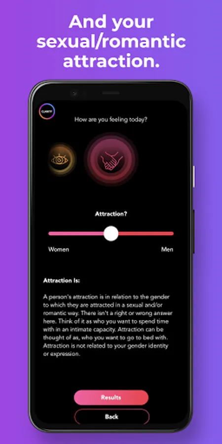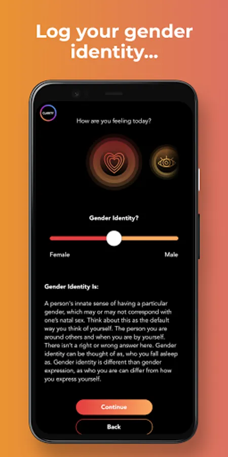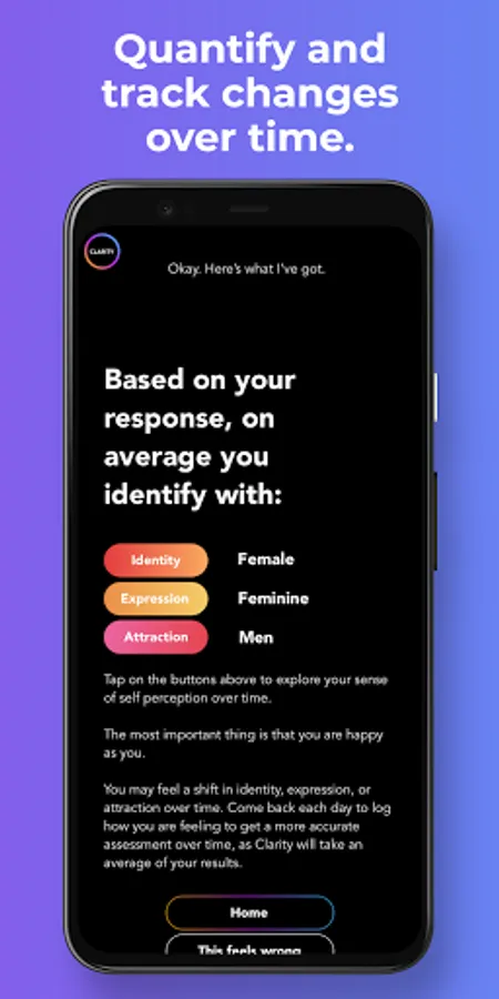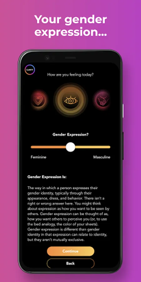 Using Clarity, you will follow a guided experience through different aspects of self-identity. You’ll start by using a series of sliders to input where you feel you fit on the spectrums of gender identity, gender expression, and attraction. The app then aggregates this input to give you some guidance and insights. If you are questioning your identity, your self-perception may fluctuate over time as you experiment and discover what feels right and what doesn’t. As you go through this process, you can return to Clarity and update the responses.