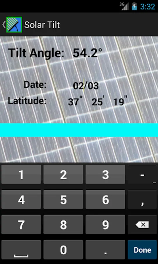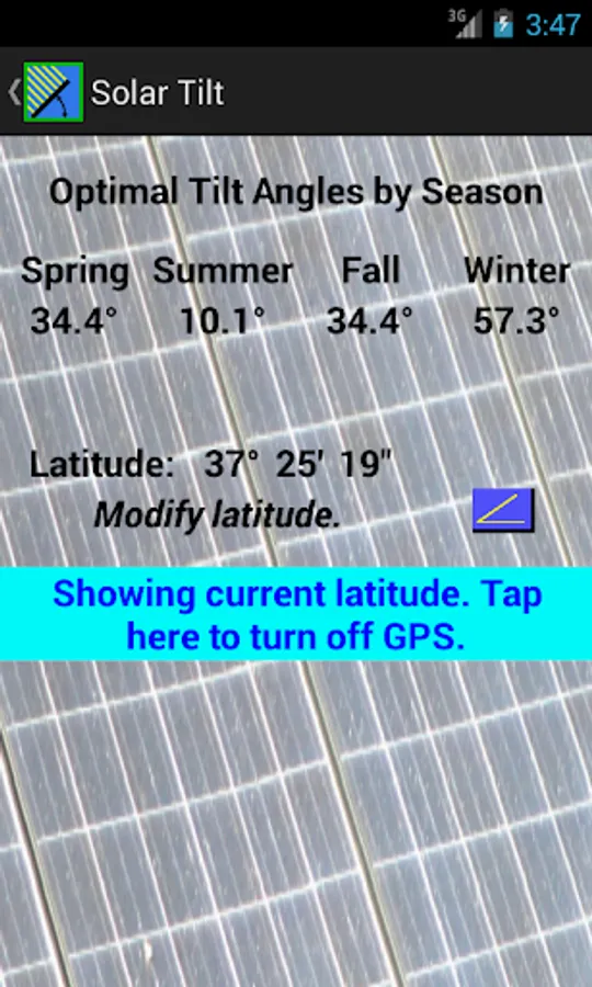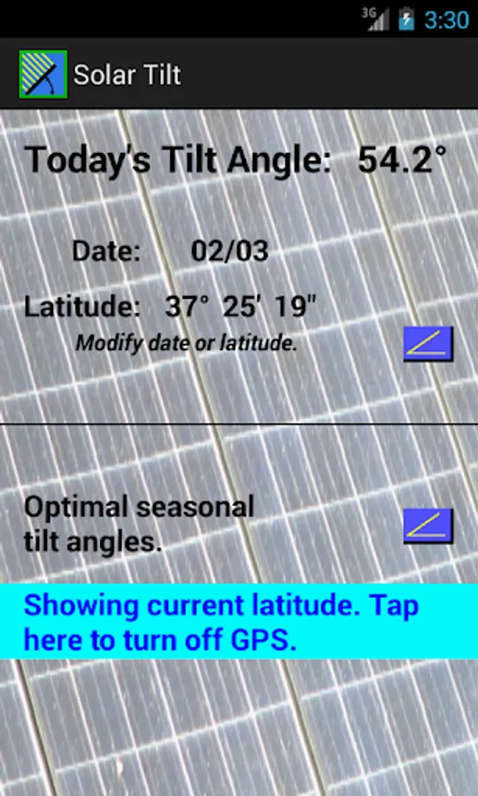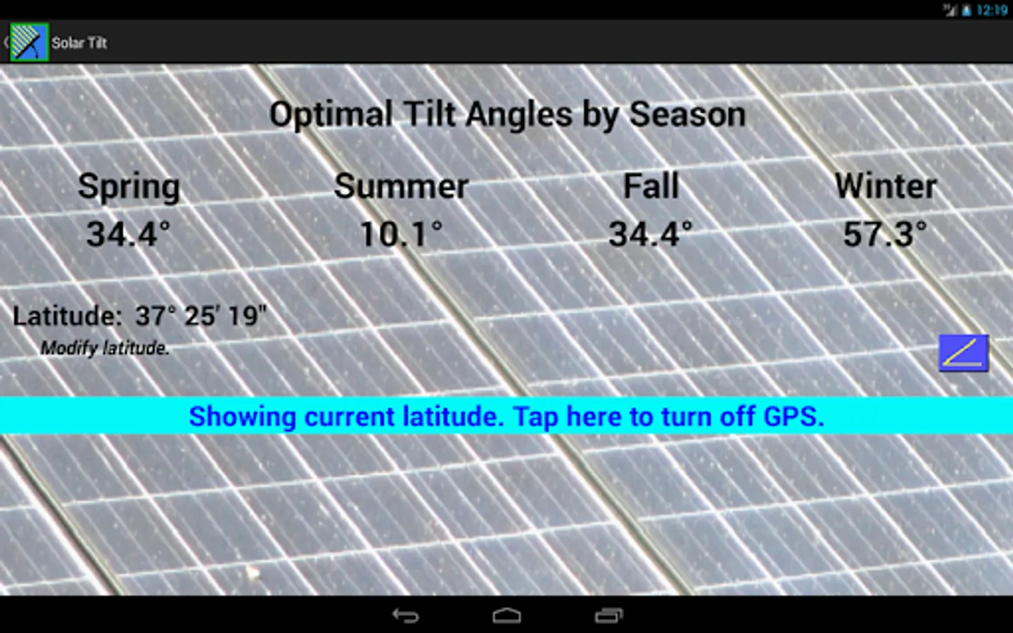 -Provides tilt angle for the current date and the latitude determined by the device's GPS location.