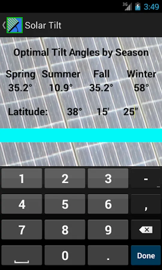 -Allows you to manually enter the latitude to calculate seasonal tilt angles for other locations.