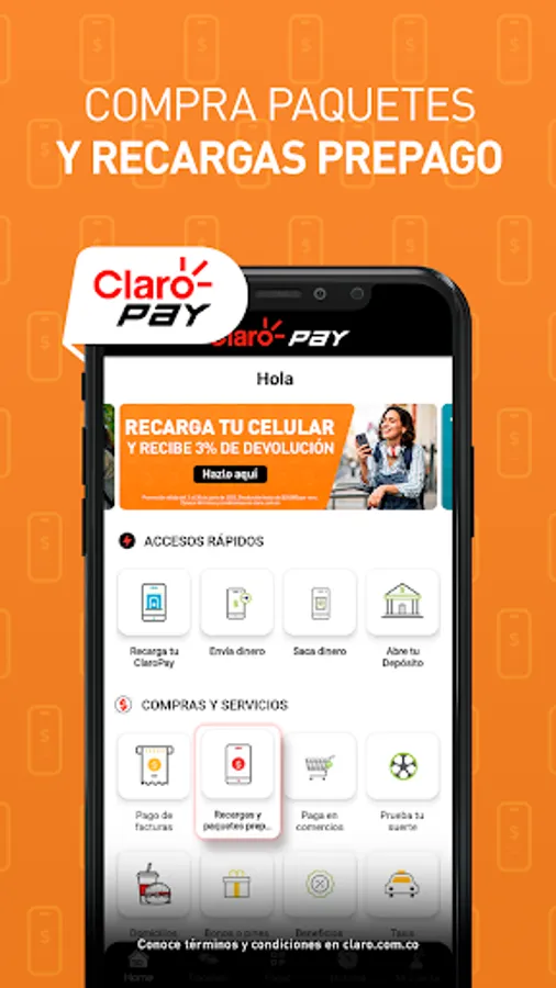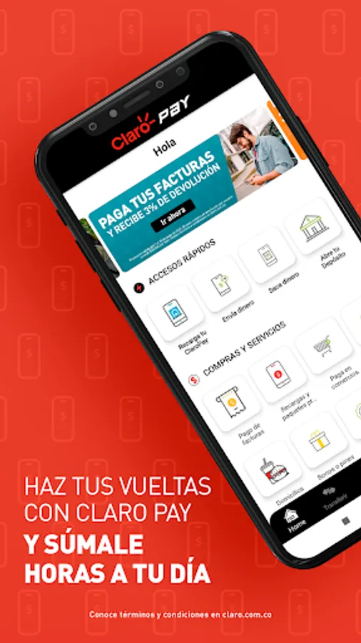 Claro Pay is the mobile wallet that allows you to make payments, purchases and recharges from your cell phone. Use it to invest, save, receive money and make use of it.