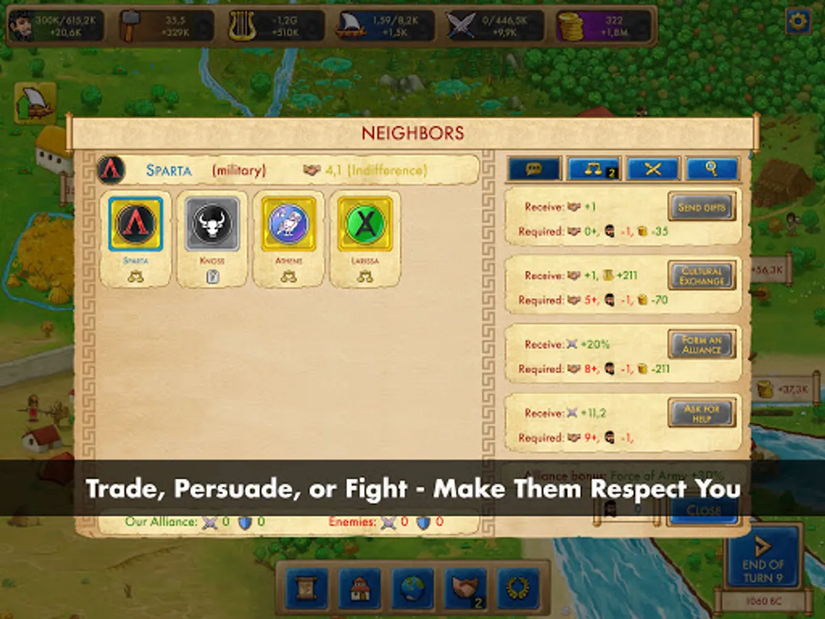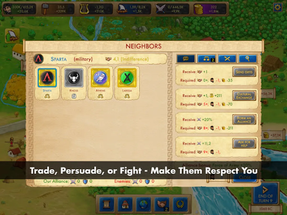 • Your choice of a city will determine the game's strategy: diplomatic style for Athens, trading style for Corinth, and military-style for Sparta.