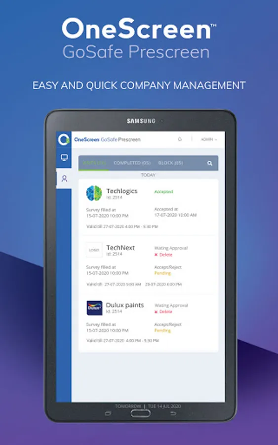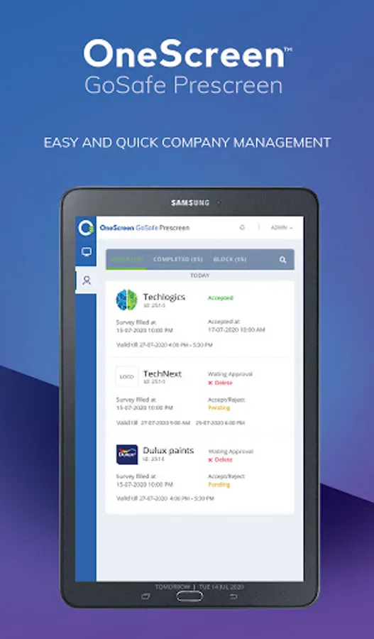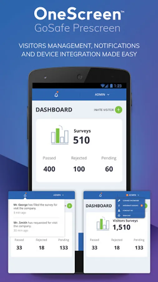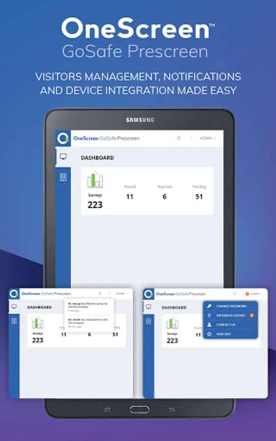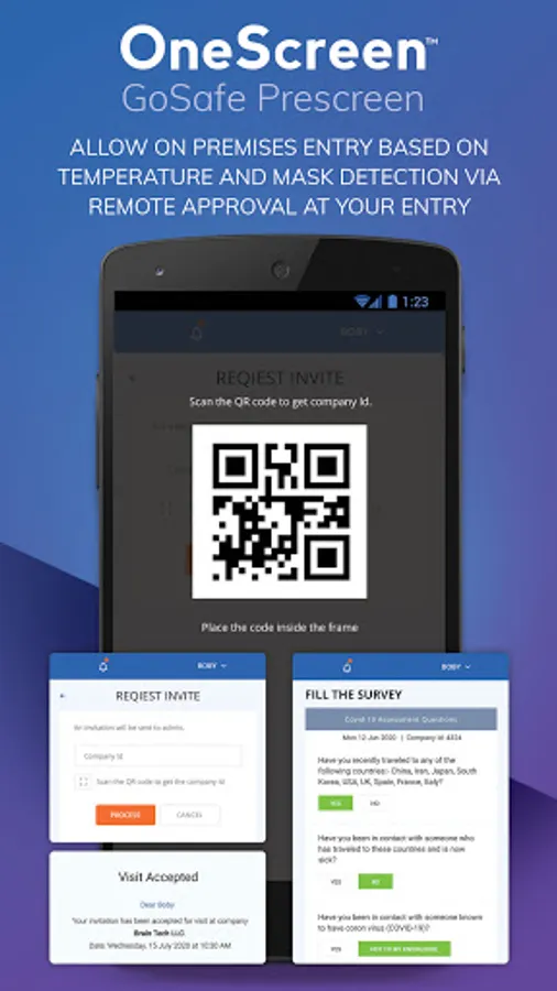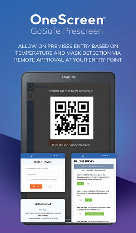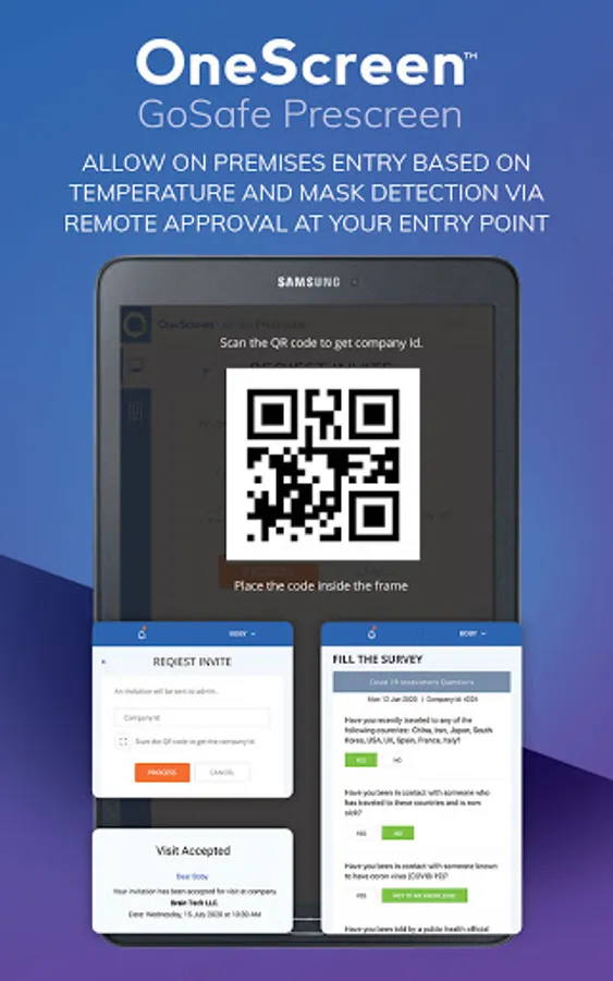 OneScreen GoSafe Prescreen works with the GoSafe temperature scanner to better manage and monitor visitor entry. By completing a short survey and providing an image, prior to attempting access, visitors will experience a quick and easy entry when they arrive.