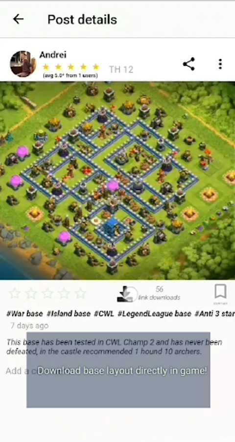 Just click 'download link' and it automatically opens and copies the base layout directly in Clash Of Clans - CoC game! No need to build or design the base yourself or use any other base builder tool!