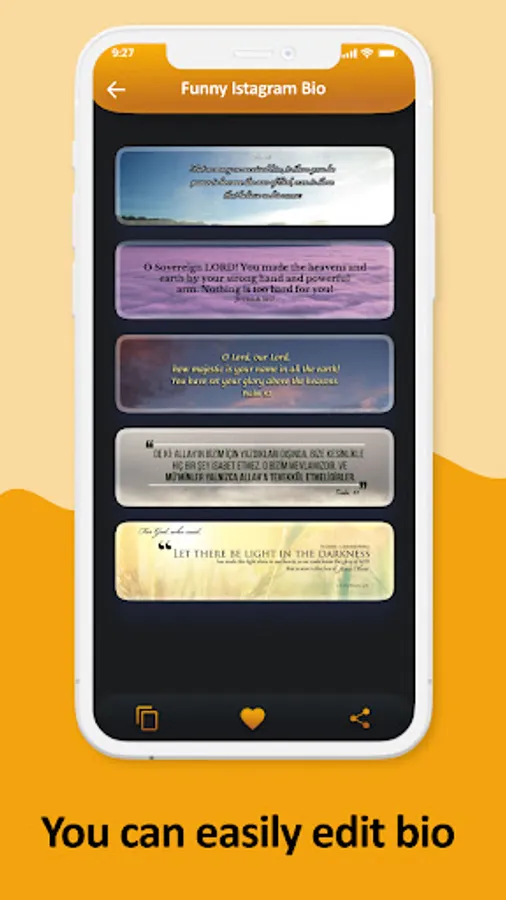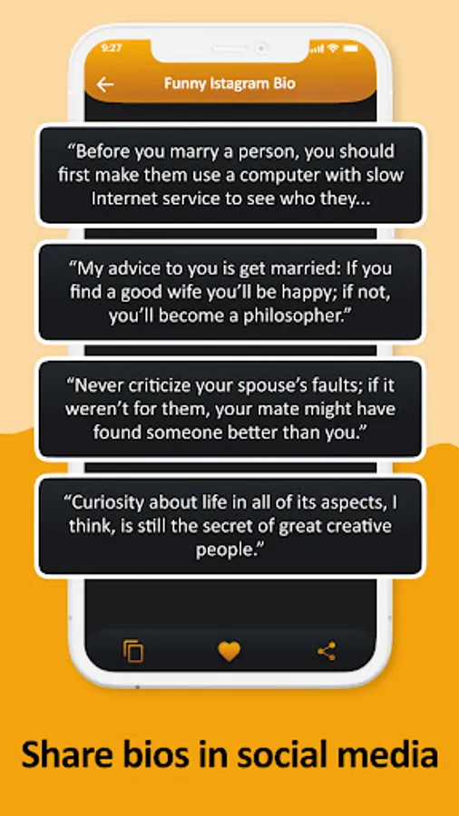 This app offers free in spiral quotes with emojis and symbols. This is the best bio app to search the bio styles from trending, popular or latest sections. Save profile bios you like to your favourite list in the app and use it anytime on your phone.