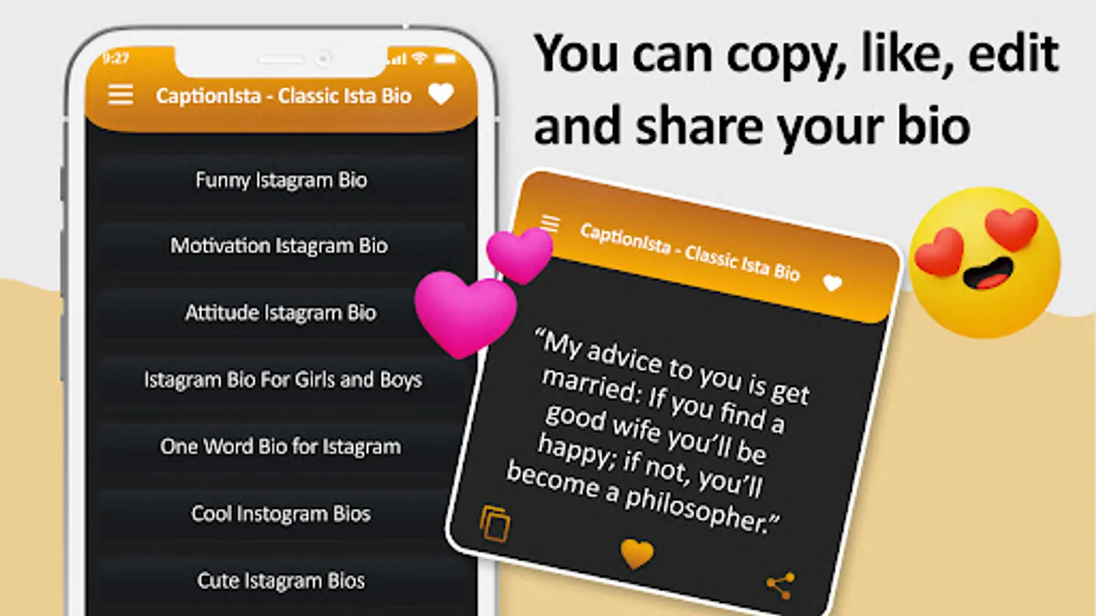 CaptionIsta - Classic Bio Lite is the quote creator app that creates attractive lines for your bio information on your social media profile. You can simply check out the available categories and select the category that suits your profile. Pick up a bio line that you like!