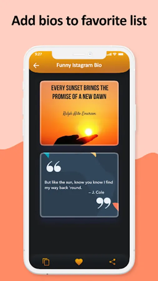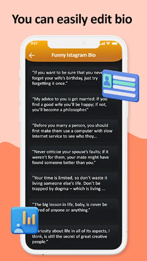Use inspirational lines, sort and filter them by your gender with this user-friendly app and gain more followers on your social media platform. These attractive bio lines with emojis will bring unique creativity to your bios and will let them look amazing!