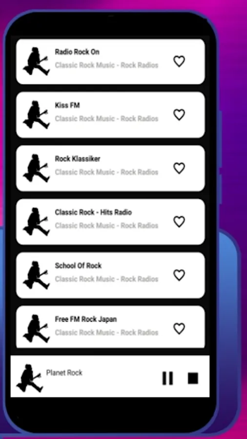 We have designed the app to listen to your favorite radios so you can find all your favorite styles, including Classic rock, Soft Rock, Blues, Alternative Rock, Metal, Hard Rock and many more!