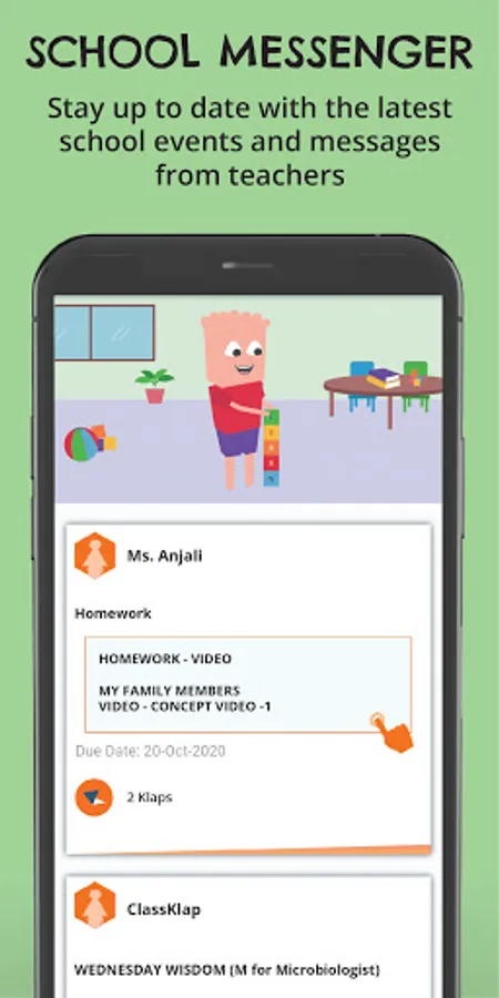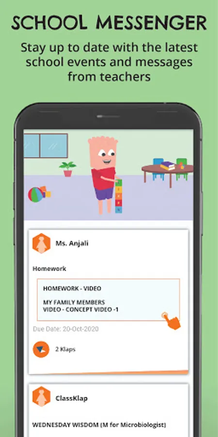 To keep the learning going, we bring the school and teachers to your place through, ClassKlap Learning App. Students can join LIVE classes from the comfort of their home through this app. With the ClassKlap Learning App, parents can stay involved with their child's scholastic progress. The app enables schools to streamline all communication with parents. The schools can reach out to parents with home-work, planned activities, captured classroom moments, daily time tables.