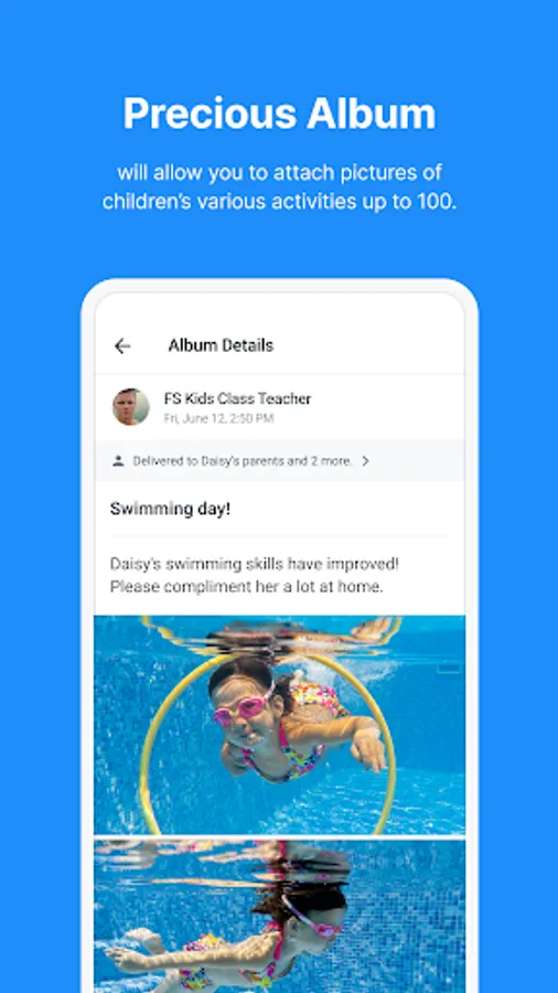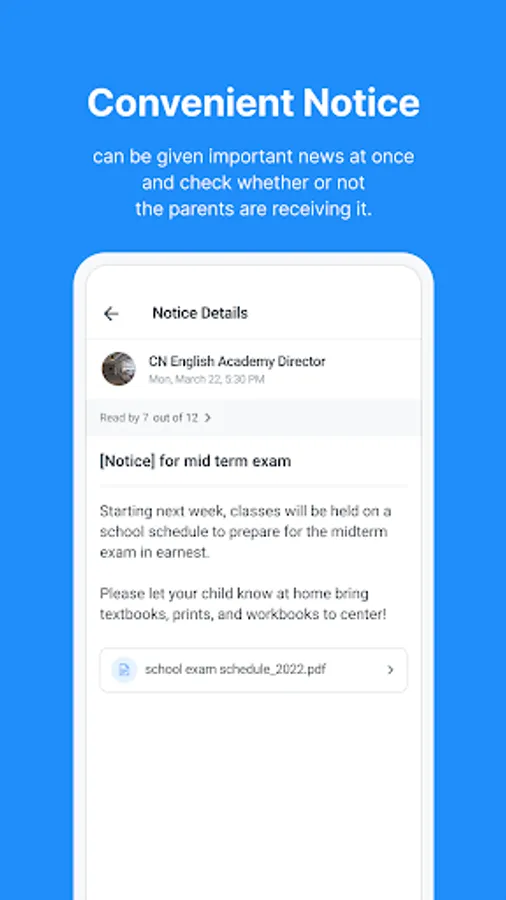 - Easy private communication between director / teacher and each parent(private 1:1 communication).