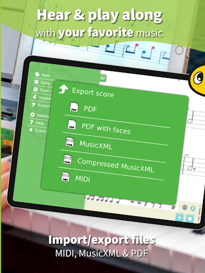• Export scores and share them with your students (MusicXML, MIDI, or PDF)