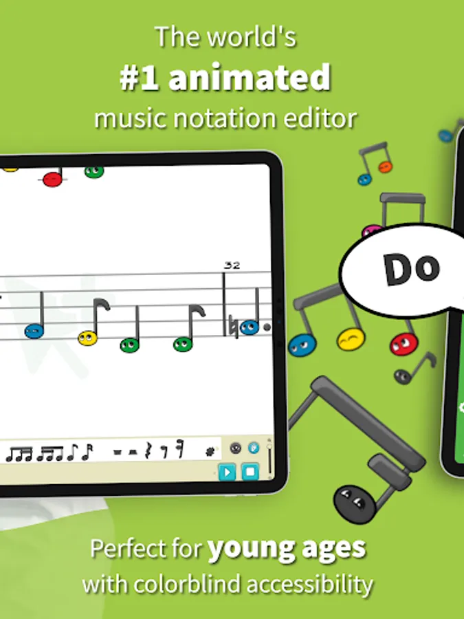 Cornelius composer is the first ANIMATED music editor, where music notes become alive! Compose, import, show, and reproduce your music by adapting the presentation to students' ages with animated and colorful music notes and accessibility features for color-blind beginners! Customize the color scale to match your boomwhackers or other instrument sets in the classroom!