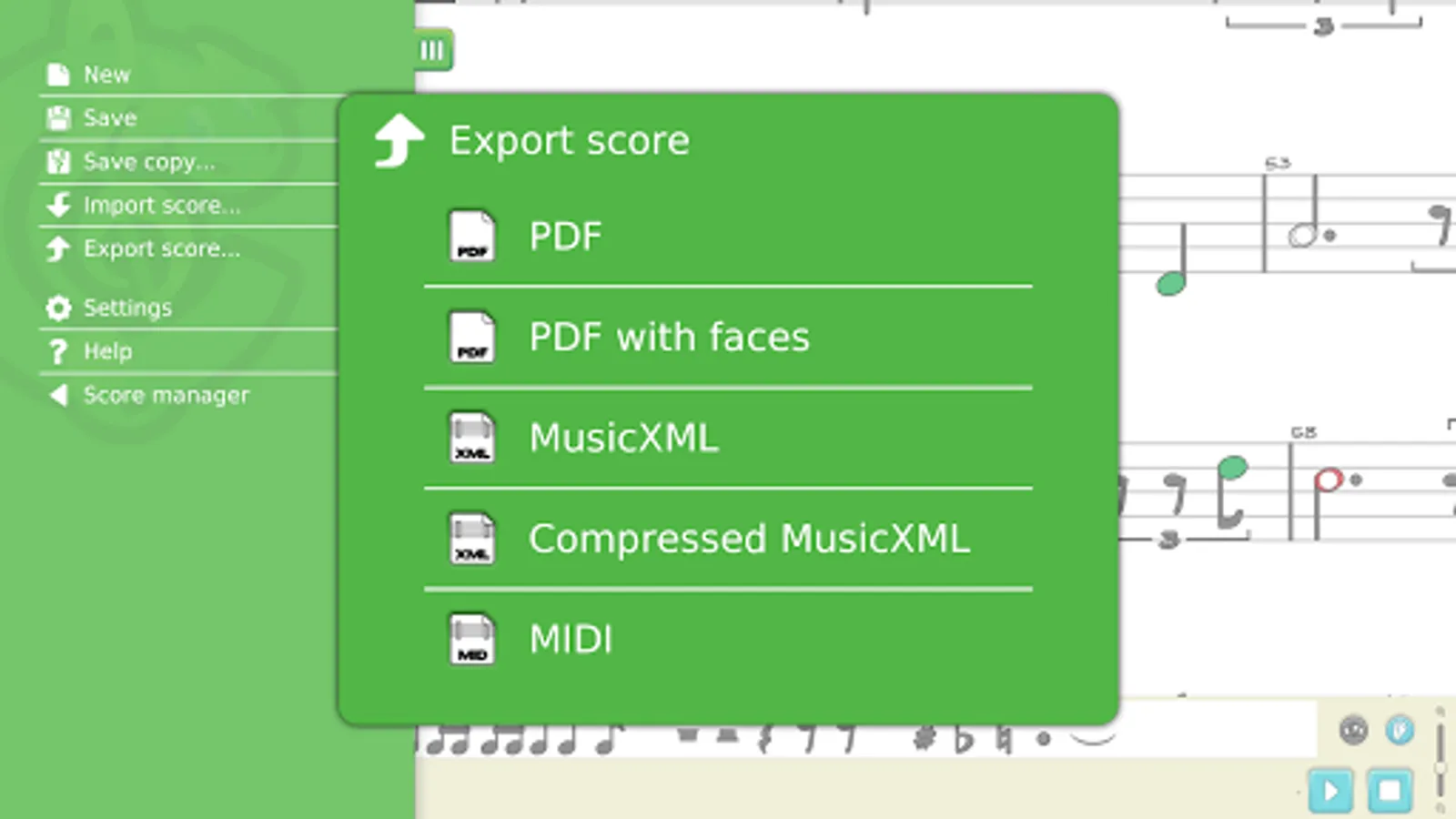 Compositions can be exported at any time for further processing in other notation software or for printing in PDF format. You can also import existing sheets in MusicXML format.