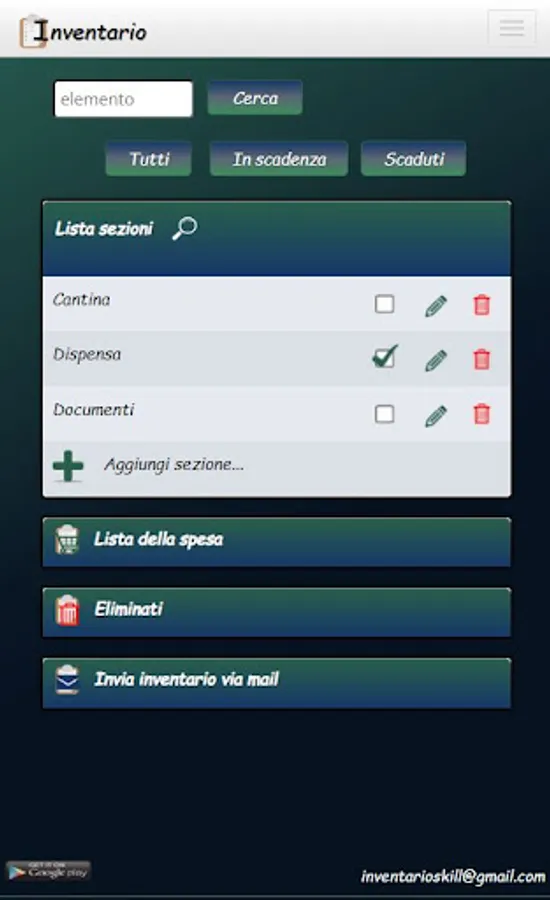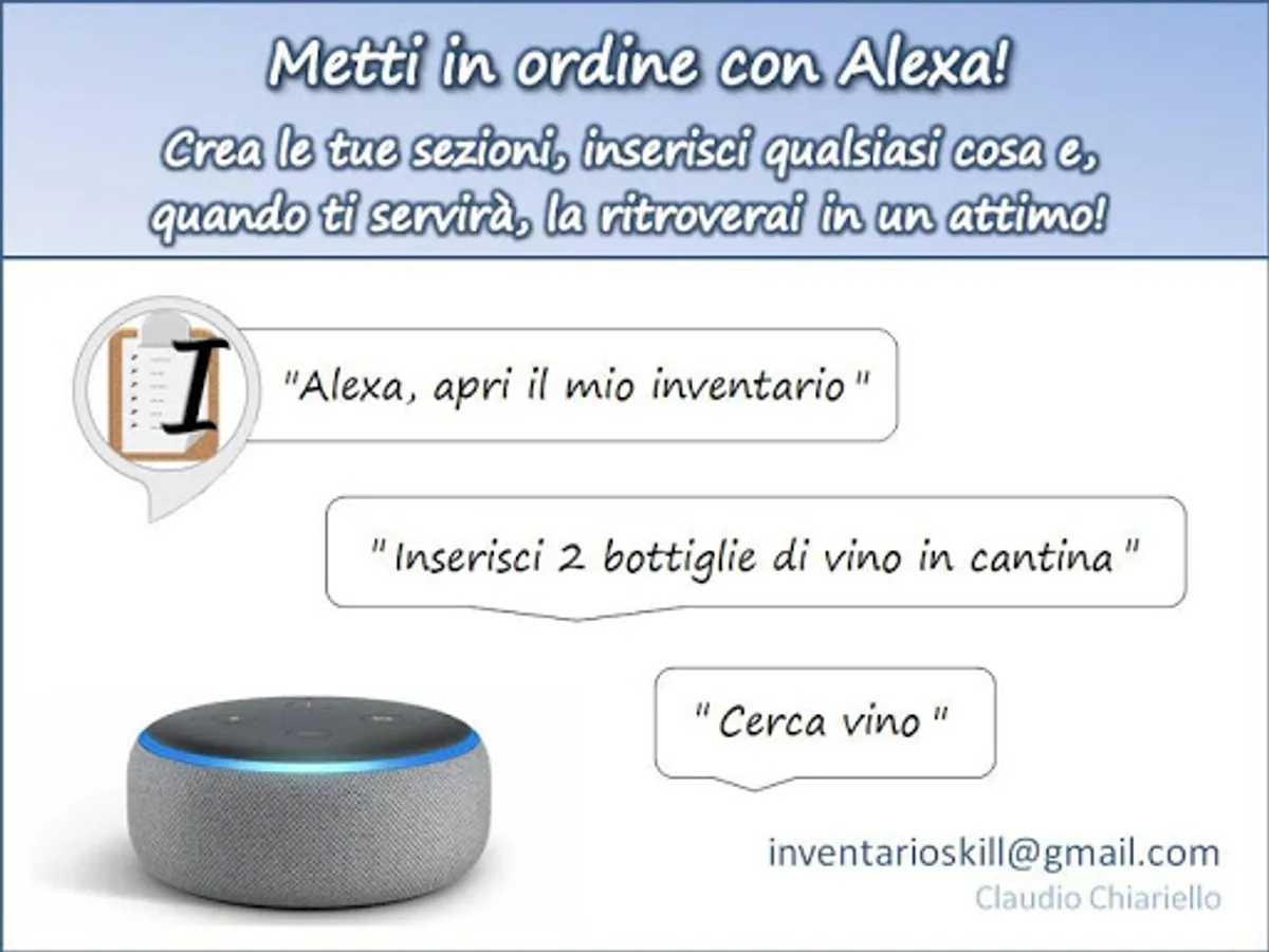 This app, along with the "Inventory" skill for Alexa, allows you to make any kind of list of items. With Alexa you will be able to consult and manage the content comfortably, it will also notify you about deadlines and will be able to manage quantities and automatically put out of stock items in the shopping list. At any time you can ask Alexa to send the contents of your inventory or of individual sections by email.