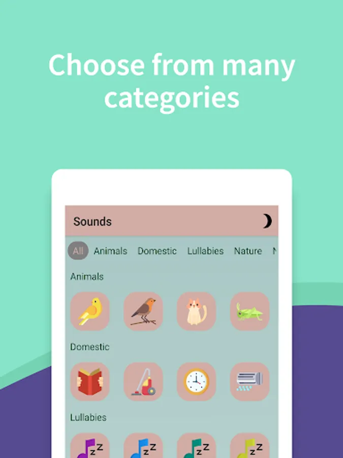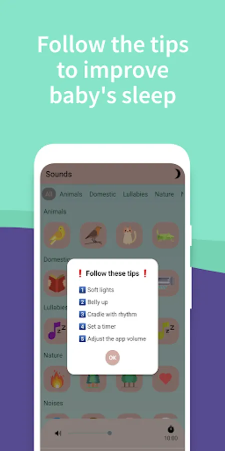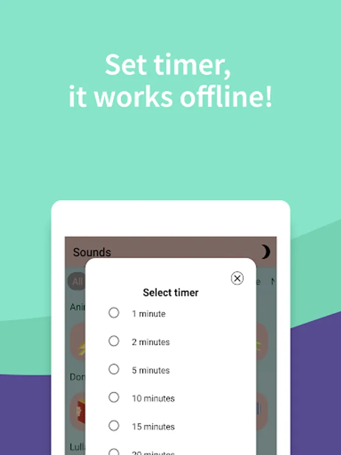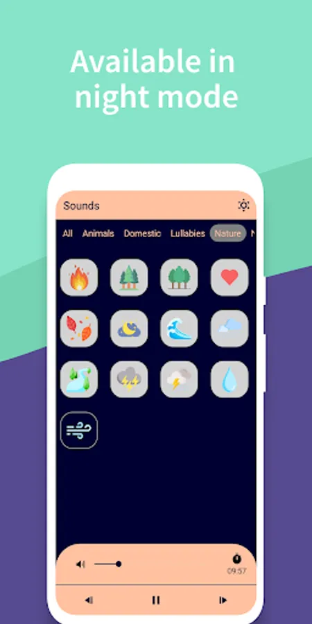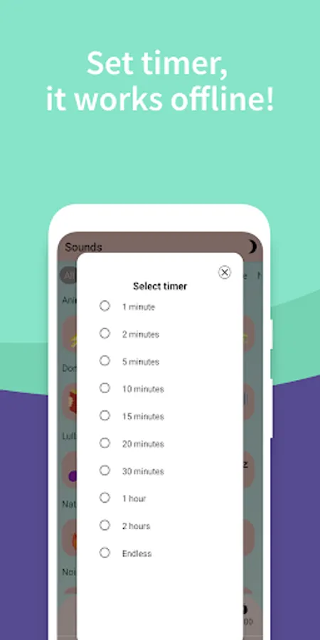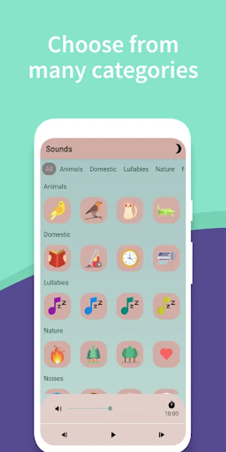 π Set the timer , choose the volume and the app will continuously play your favorite sound. As soon as the time runs out, the sound will stop, allowing you to save battery.