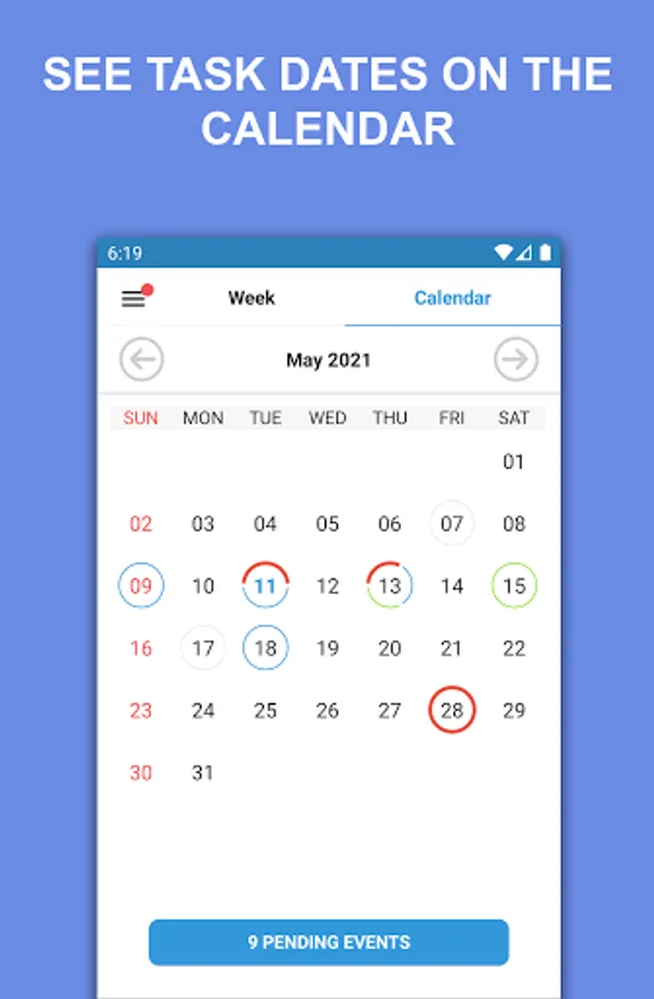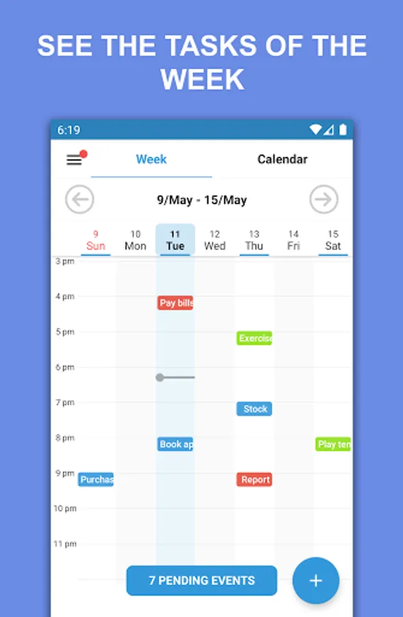 The events/tasks are initially organized by the app in the Week and Calendar tabs, that helps in viewing and planning your Task Agenda.